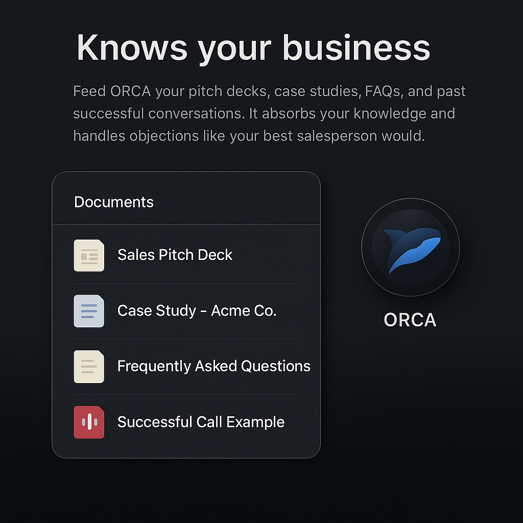 Upload your materials and connect social accounts. ORCA learns your audience, offers, objections, and tone becoming an expert in days.